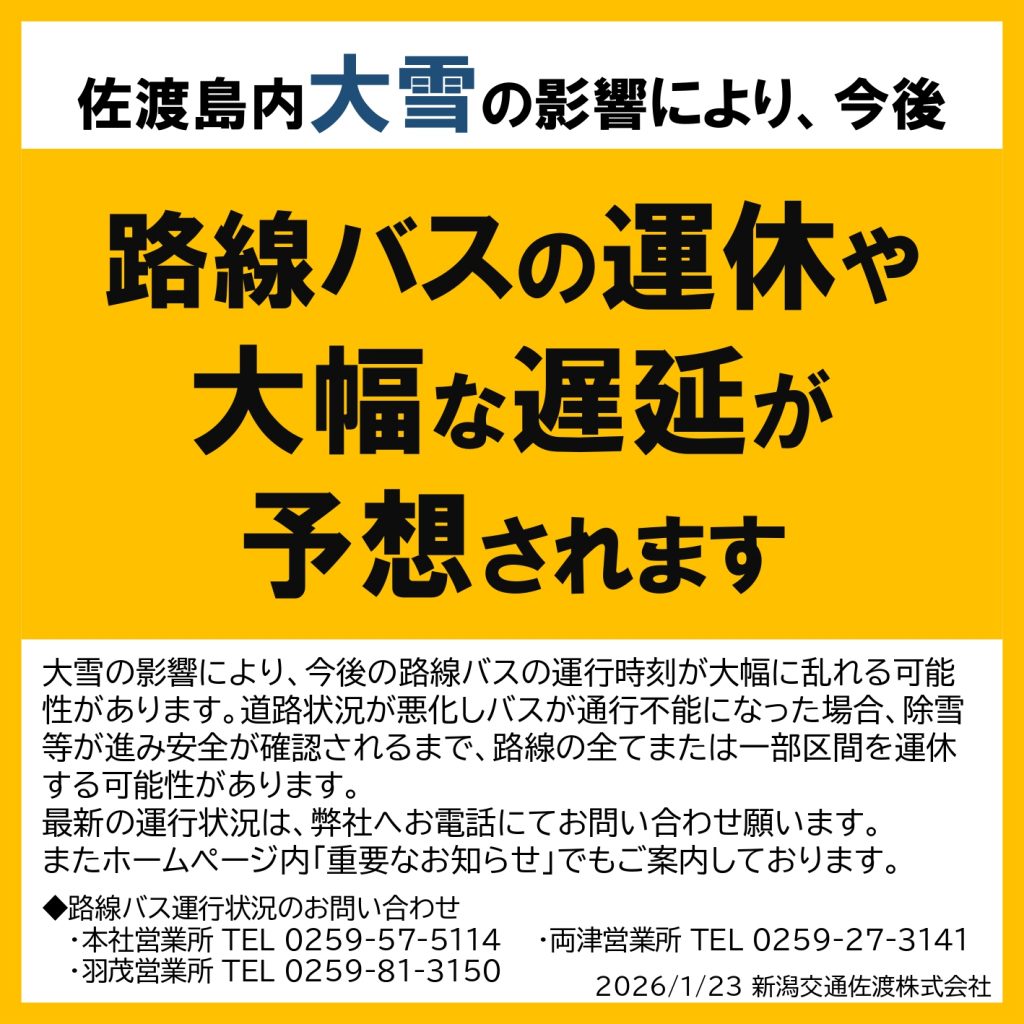日頃、バスをご利用いただきありがとうございます。1月20日から続いている強い寒気による大雪が見込まれるため、1月24日(土)以降、運行の取りやめ、迂回運行 及び降雪・積雪による道路状況の悪化で遅延が発生する可能性がございます。